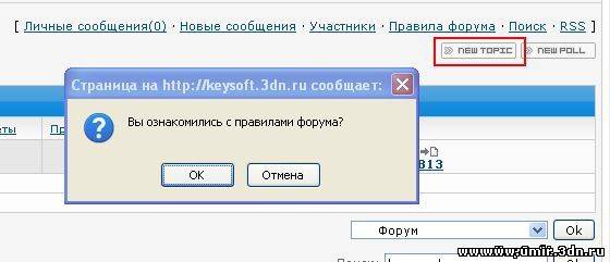 Описание: при клике по кнопке Создать тему, скрипт спрашивает: Ознакомились ли вы с правилами. Если нажать ОК, перейдете к созданию темы, если Отмена, то к странице с правилами. Скрипт ставим в шаблон Общий вид страниц форума, после $BODY$
