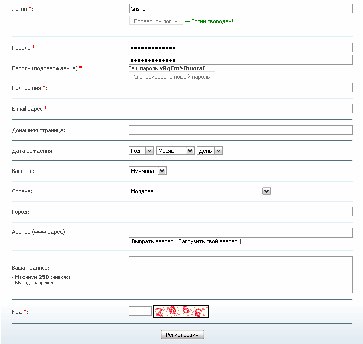 <?if($LOGIN_FL$)?> <tr id="siM42"><td class="manTd1" width="34%" id="siM43">$LOGIN_SIGN$</td><td class="manTd2" id="siM44">$LOGIN_FL$</td></tr> <tr><td class="manTd1" width="17%"></td><td class="manTd2"><a href="#" onclick="return false" id="checkLogin" style="font-size:9px"><input style="border: 1px solid rgb(223, 223, 223); background: rgb(255, 255, 255) none repeat scroll 0% 0%; height: 18px; font-family: tahoma; font-size: 11px; -moz-background-clip: -moz-initial; -moz-background-origin: -moz-initial; -moz-background-inline-policy: -moz-initial; color: rgb(117, 117, 117);" title="Проверить доступность логина для регистрации" return false;" value="Проверить логин" type="button"></a><span id="resaltCheck"></span></td></tr><tr><td height="10" class="manTdSep" colspan="2"></td></tr> <?endif?> </td></tr> <tr><td class="manTdSep" colspan="2"><hr class="manHr" /></td></tr> </script></td></tr><tr></td></tr> <script type="text/javascript"> var m_strUpperCase = "ABCDEFGHIJKLMNOPQRSTUVWXYZ"; var m_strLowerCase = "abcdefghijklmnopqrstuvwxyz"; var m_strNumber = "0123456789"; var m_strCharacters = "_-" // Check password function checkPassword(strPassword) { // Reset combination count var nScore = 0; // Password length // -- Less than 4 characters if (strPassword.length < 5) { nScore += 10; } // -- 5 to 7 characters else if (strPassword.length > 4 && strPassword.length < 8) { nScore += 20; } // -- 8 or more else if (strPassword.length > 7) { nScore += 50; } // Letters var nUpperCount = countContain(strPassword, m_strUpperCase); var nLowerCount = countContain(strPassword, m_strLowerCase); var nLowerUpperCount = nUpperCount + nLowerCount; // -- Letters are all lower case if (nUpperCount == 0 && nLowerCount != 0) { nScore += 20; } // -- Letters are upper case and lower case else if (nUpperCount != 0 && nLowerCount != 0) { nScore += 40; } // Numbers var nNumberCount = countContain(strPassword, m_strNumber); // -- 1 number if (nNumberCount == 1) { nScore += 20; } // -- 3 or more numbers if (nNumberCount >= 3) { nScore += 40; } // Characters var nCharacterCount = countContain(strPassword, m_strCharacters); // -- 1 character if (nCharacterCount == 1) { nScore += 20; } // -- More than 1 character if (nCharacterCount > 1) { nScore += 50; } // Bonus // -- Letters and numbers if (nNumberCount != 0 && nLowerUpperCount != 0) { nScore += 4; } // -- Letters, numbers, and characters if (nNumberCount != 0 && nLowerUpperCount != 0 && nCharacterCount != 0) { nScore += 6; } // -- Mixed case letters, numbers, and characters if (nNumberCount != 0 && nUpperCount != 0 && nLowerCount != 0 && nCharacterCount != 0) { nScore += 10; } return nScore; } // Runs password through check and then updates GUI function runPassword(strPassword, strFieldID) { // Check password var nScore = checkPassword(strPassword); // Get controls var ctlBar = document.getElementById(strFieldID + "_bar"); var ctlText = document.getElementById(strFieldID + "_text"); if (!ctlBar || !ctlText) return; // Set new width ctlBar.style.width = nScore + "%"; // Color and text // -- Безупречный if (nScore >= 45) { var strText = "Отличный пароль!"; var strColor = "#0ca908"; } // -- Хороший else if (nScore >= 40) { var strText = "Хороший"; var strColor = "#00CCFF"; } // -- Довольно нормальный else if (nScore >= 35) { var strText = "Достаточно неплохо"; var strColor = "#5a74e3"; } // -- Нормальный else if (nScore >= 30) { var strText = "Нормально"; var strColor = "#FF6600"; } // -- Слабый else if (nScore >= 20) { var strText = "Слабенько"; var strColor = "#e7d61a"; } // -- Очень плохой else { var strText = "Ужас. qwerty и то лучше"; var strColor = "#e71a1a"; } ctlBar.style.backgroundColor = strColor; ctlText.innerHTML = "<span style='color: " + strColor + ";'>" + strText + "</span>"; } // Checks a string for a list of characters function countContain(strPassword, strCheck) { // Declare variables var nCount = 0; for (i = 0; i < strPassword.length; i++) { if (strCheck.indexOf(strPassword.charAt(i)) > -1) { nCount++; } } return nCount; } </script> <?if($PASSWORD_FL$)?> <?endif?> <?if($PASSWORD1_FL$)?> <?endif?> <table class="manTable" id="siM63" width="100%" border="0" cellpadding="2" cellspacing="1"> <tbody> <tr id="siM45"><td class="manTd1" id="siM46">$PASSWORD_SIGN$</td><td class="manTd2" id="siM47"><input id="siF14" class="manFlPassw" name="password" size="20" style="width: 100%; font-weight: 500; font-style: normal; color: rgb(0, 0, 0);" maxlength="15" onkeyup="runPassword(this.value, 'mypassword');" type="password"></td></tr> <tr id="siM48"><td class="manTd1" id="siM49">$PASSWORD1_SIGN$</td><td class="manTd2" id="siM50">$PASSWORD1_FL$ <script> Chars = new Array () for (j = 65; j <=122; j++){ if ((j < 91) || (j > 96)) { Chars[Chars.length] = String.fromCharCode(j); } } function GenerateRandomPassword(){ PassLength = 10 + Math.round(5 * Math.random()); Pass = '' for (i = 0; i < PassLength; i++){ ChIndex = Math.round(Chars.length * Math.random()) - 1; if ((Chars[ChIndex]) && (Pass.length < 15)) { Pass += Chars[ChIndex]; } } return Pass; } function NewPass(){ NewRandPass = GenerateRandomPassword(); $('#siF14, #siF15').attr('value', NewRandPass); $('#RandPass').hide('fast').html('Ваш пароль <b>' + NewRandPass + '</b><br><a href="javascript://" style="font-size: 9px; " onclick="NewPass()"><input style="border: 1px solid rgb(223, 223, 223); background: rgb(255, 255, 255) none repeat scroll 0% 0%; height: 18px; font-family: tahoma; font-size: 11px; -moz-background-clip: -moz-initial; -moz-background-origin: -moz-initial; -moz-background-inline-policy: -moz-initial; color: rgb(117, 117, 117);" title="Сгенерировать новый пароль для регистрации" return false;" value="Сгенерировать новый пароль" type="button"></a>').show('