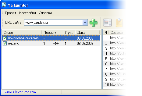 Яндекс является одной из самых популярных поисковых систем в русской части Интернет. С помощью Ya Monitor вы можете узнать какие позиции занимает ваш сайт в топе Яндекса для всех ваших ключевых слов. Программа поддерживает работу через прокси, умеет экспортировать полученные результаты в CSV, проста и удобна в применении и, самое главное, - абсолютно бесплатна!